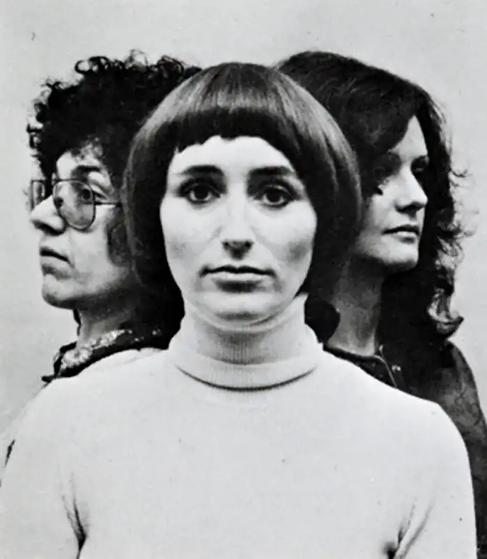 Not long after beginning to teach at CalArts, de Bretteville joined with fellow art faculty Judy Chicago and Arlene Raven to form a new offshoot, independent program they named the Feminist Studio Workshop. The initial brochure usefully repeats a picture of the three founding women together, each taking turns facing the camera. Here is the one with Sheila facing forward [↓].